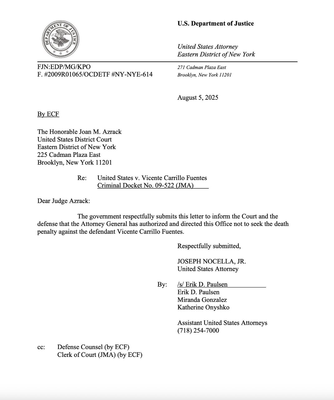 Respecto a Vicente Carrillo Fuentes, alias “El Viceroy”, exlíder del Cártel de Juárez, el fiscal notificó la misma decisión al despacho de la jueza Joan M. Azrack. Carrillo Fuentes fue detenido en México en 2014 y extraditado a Estados Unidos en febrero de 2025, como parte de un grupo de 29 presuntos criminales entregados por el Gobierno mexicano.