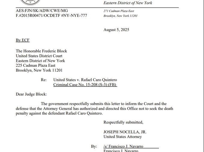 En el caso de Rafael Caro Quintero, fundador del extinto Cártel de Guadalajara, la decisión fue notificada al juez Frederic Block. Caro Quintero es acusado, entre otros cargos, por el secuestro y asesinato en 1985 del agente de la DEA Enrique “Kiki” Camarena. Fue recapturado en México en 2022 por elementos de la Marina, tras permanecer prófugo desde su liberación en 2013.