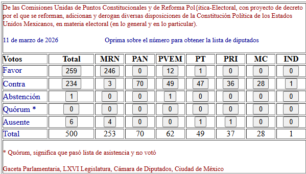 La iniciativa obtuvo 259 votos a favor, 234 en contra y una abstención, por lo que no logró los 334 votos requeridos para aprobar una reforma constitucional. La falta de respaldo de legisladores del Partido del Trabajo (PT) y del Partido Verde Ecologista de México (PVEM), aliados de Morena, fue determinante para el resultado.