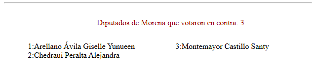 En la bancada de Morena, la mayoría de los legisladores respaldó la reforma; sin embargo, tres diputadas votaron en contra: Giselle Arellano Ávila, Alejandra Chedraui Peralta y Santy Montemayor.