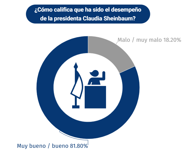El sondeo “Aprobación presidencial, Febrero 2025” evidenció que el 81.80% de las y los entrevistados consideró que el desempeño de Sheinbaum al frente del ejecutivo ha sido “Muy bueno o bueno”, en contraste con el marginal 18.2% que opinó que su desempeño ha sido malo, lo que representa un incremento en la simpatía por la mandataria ya que, un estudio realizado en enero la colocó con un 81.1% de aprobación.