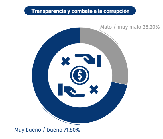 Por otro lado, el 71.80% de las y los encuestados afirmó que las labores en pro de la transparencia y combate a la corrupción realizadas desde la toma de posesión de Sheinbaum, el pasado 1° de octubre, han sido “muy buenas o buenas”, en contraste con el 28.20% que las calificó como “malas o muy malas”.