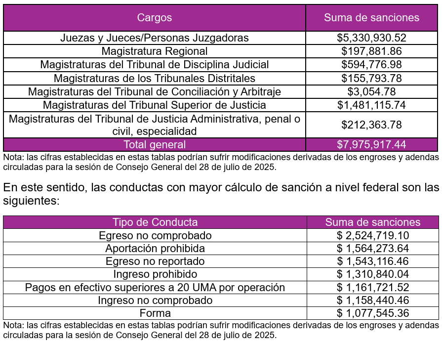 Ante esta situación, se propuso sancionar a las candidaturas a un cargo del PJF por un monto global de 10 millones 364 mil 410 pesos. Del total de este monto 4 millones 27 mil 325.50 pesos corresponden a sanciones para los aspirantes a jueces y juezas de distrito.