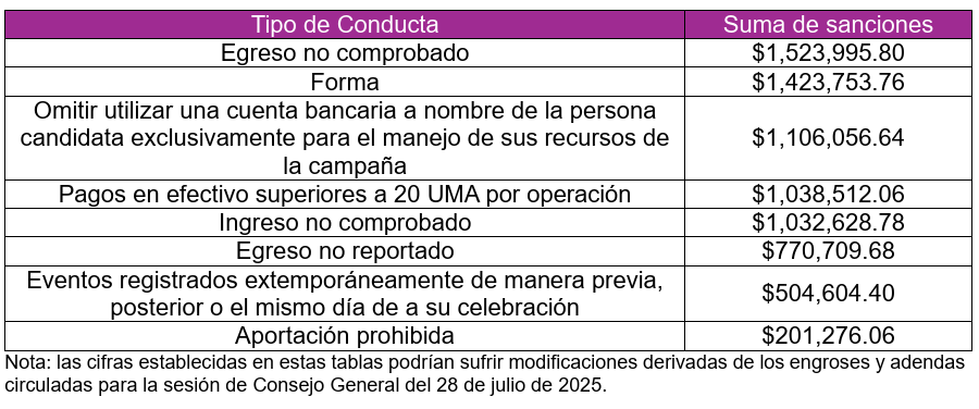 Además, el INE detalló que las conductas con mayor cálculo de sanción a nivel federal fueron “Egreso no comprobado” con 2 millones 524 mil 719.10 pesos. Le siguen “Aportación prohibida” con un millón 564 mil 273.64 pesos. “Egreso no reportados” se sancionó con un millón 543 mil 116.46 pesos. Ingreso prohibido fue sancionado con un millón 310 mil 840.04 pesos. “Pagos en efectivo superiores a 20 UMA por operación” con un millón 161 mil 721.52 pesos. “Ingreso no comprobado” con un millón 077 mil 545.36 pesos. Y la conducta identificada como “Forma” con un millón 158 mil 440.46 pesos.