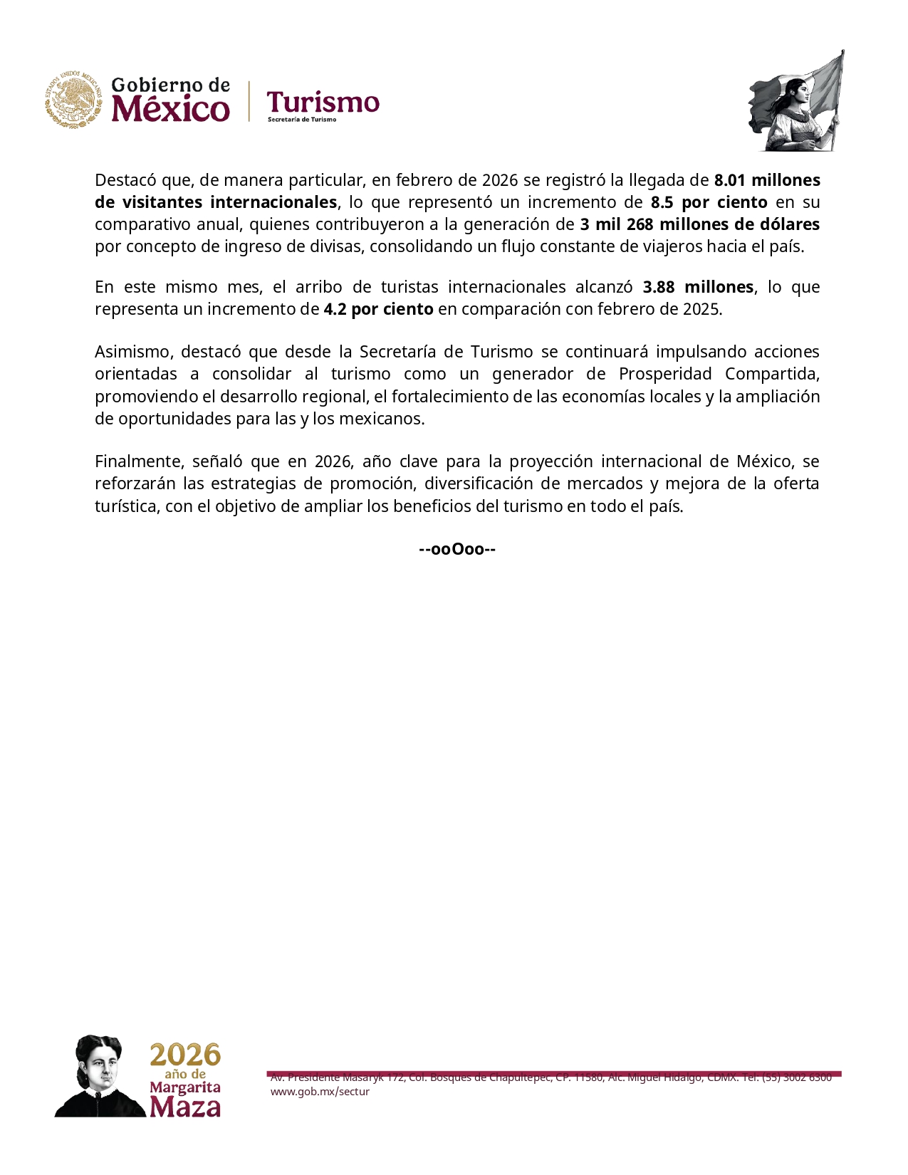 La funcionaria destacó que, de manera particular, en febrero de 2026 se registró la llegada de 8.01 millones de visitantes internacionales, lo que representó un incremento de 8.5% en su comparativo anual, quienes contribuyeron a la generación de 3 mil 268 millones de dólares por concepto de ingreso de divisas, consolidando un flujo constante de viajeros hacia el país.