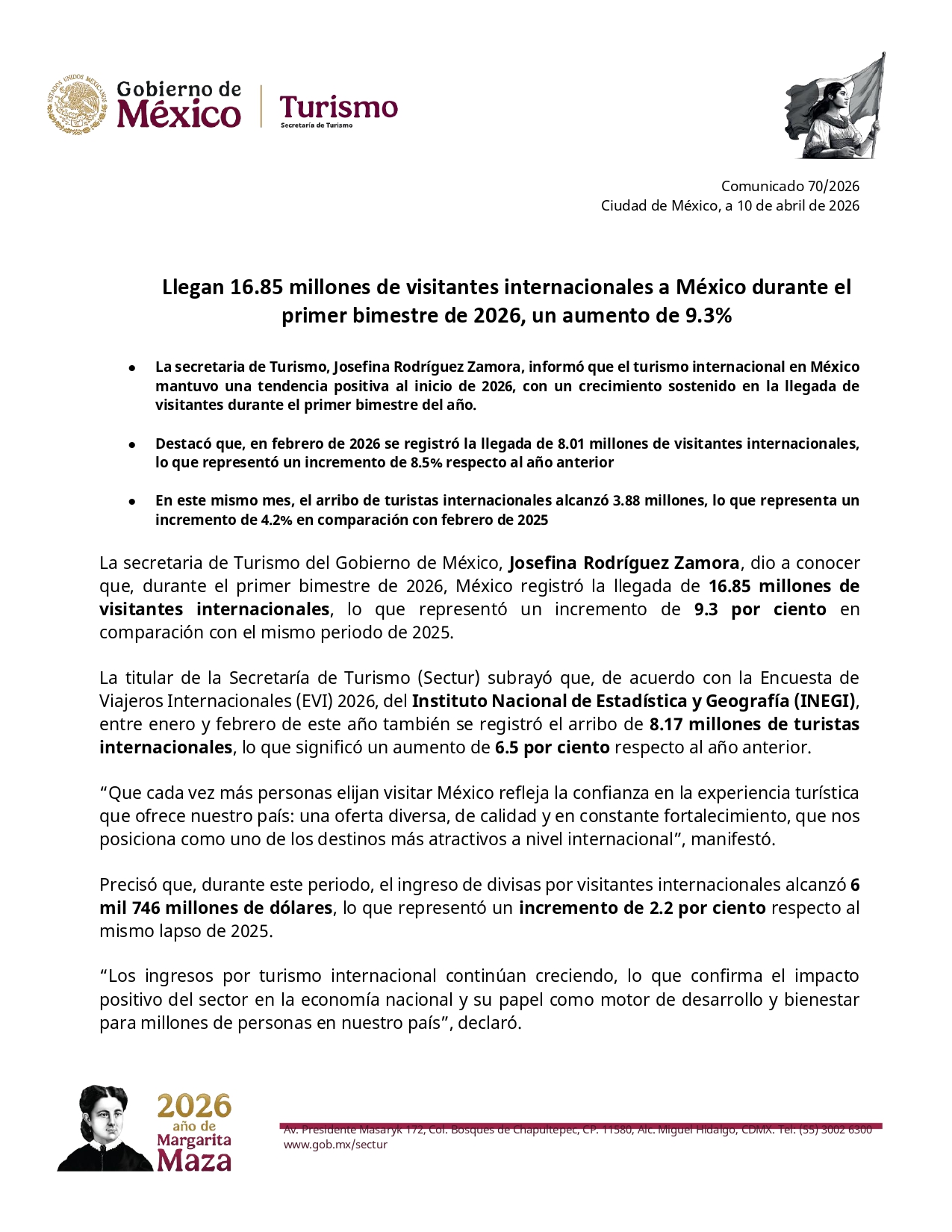 A través de un comunicado, la secretaria de Turismo del Gobierno de México, Josefina Rodríguez Zamora, dio a conocer que, durante el primer bimestre de 2026, México registró la llegada de 16.85 millones de visitantes internacionales, lo que representó un incremento de 9.3% en comparación con el mismo periodo de 2025.