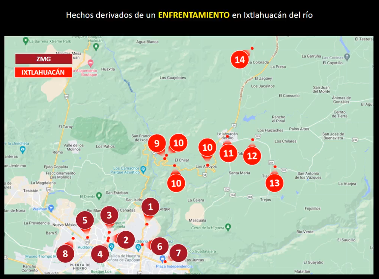 El recuento de daños por los enfrentamientos en la Zona Metropolitana de Guadalajara (ZMG) fue un total de cinco vehículos calcinados, un negocio incendiado y dos lugares identificados como “poncha llantas”. A su vez en Ixtlahuacán fue un total de 14 vehículos calcinados, dos vehículos con impactos de bala, una persona lesionada y tres personas fallecidas.