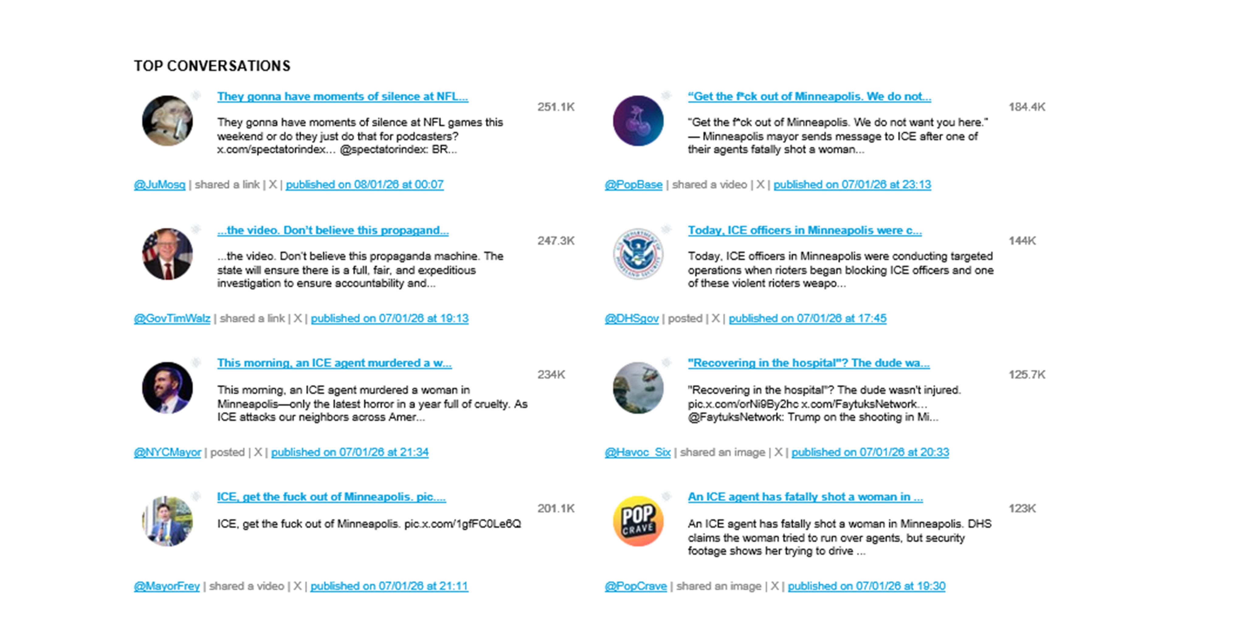 El análisis de hashtags del investigar mostró una narrativa dominante que señala el hecho como un presunto crimen de Estado, atribuido directamente a elementos del Servicio de Inmigración y Control de Aduanas (#ICE). En miles de publicaciones se denunciaron impunidad y abusos de poder, además de llamados a la resistencia civil.