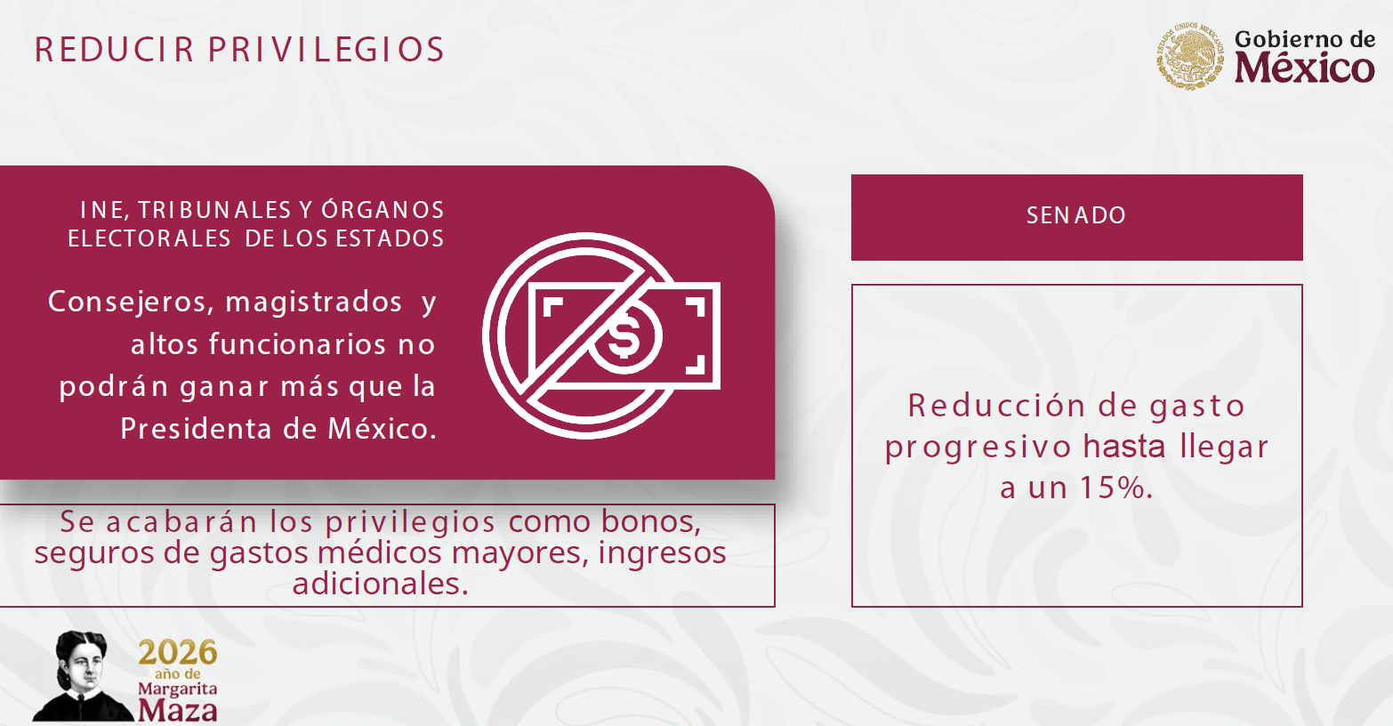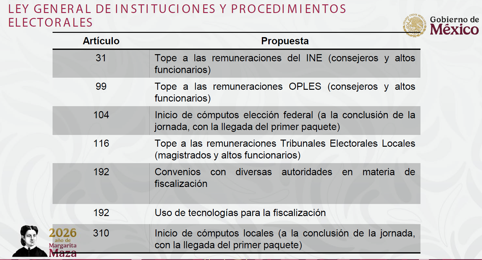 Por su parte, la titular de la Secretaría de Gobernación, Rosa Icela Rodríguez, explicó que la iniciativa presidencial, conocida como Plan B, tiene como principio fundamental disminuir los privilegios y excesos en el ejercicio de la función pública, así como reducir costos y actuar bajo el principio de la austeridad republicana.