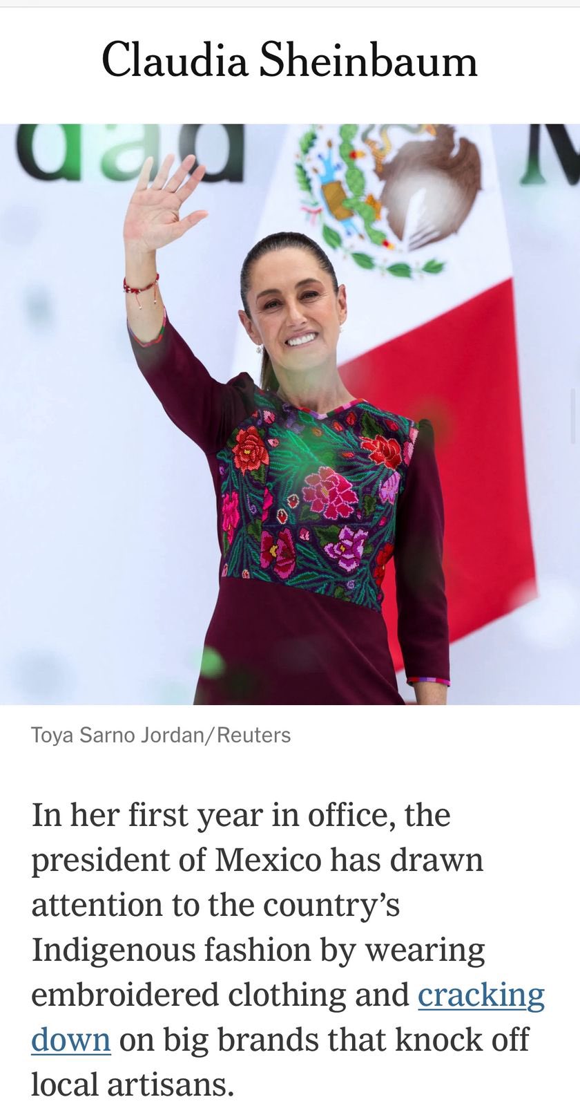 En su sitio web, el diario destaca: “En su primer año en el cargo, la presidenta de México ha llamado la atención sobre la moda indígena del país vistiendo ropa bordada y actuando contra las grandes marcas que imitan a los artesanos locales”.