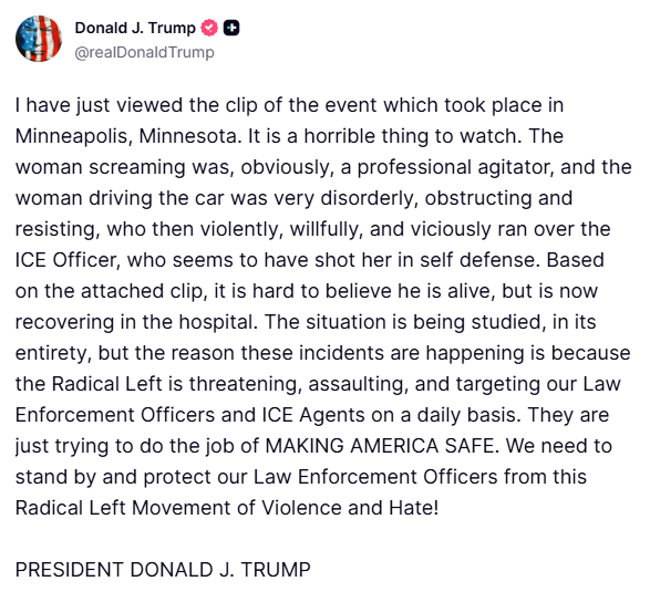 Por su parte, el presidente de Estados Unidos, Donald Trump, señaló en la red social Truth Social que vio el video que circula en redes sociales en el que presuntamente un agente del ICE disparó contra una mujer que, según se afirma, se resistía a un arresto.