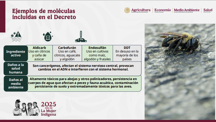 Explicó que cuatro de estas moléculas son Aldicarb, Carbofurán, Endosulfán y DDT, las cuales son cancerígenas, afectan el sistema nervioso central y, entre otras cosas, son altamente para tóxicos para diversos tipos de polinizadores.
