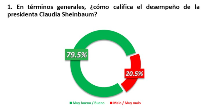 De acuerdo con el estudio, a la pregunta ¿cómo califica el desempeño de la presidenta Claudia Sheinbaum? el 79.5% indicó que bueno o muy bueno y el 20.5% malo o muy malo.