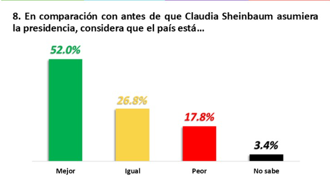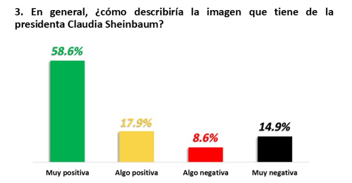 Por otro lado, respecto a la imagen de la mandataria mexicana, el 58.6% indicó que es muy positiva, el 17.9% algo positiva, 8.6% algo negativa y 14.9% muy negativa.
