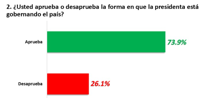 Respecto a la pregunta ¿usted aprueba o desaprueba la forma en que la presidenta está gobernado el país?, el 73.9% los aprobó y 26.1% lo desaprobó.