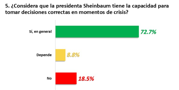Sobre la capacidad de Sheinbaum Pardo para tomar decisiones correctas en momentos de crisis, el 72.7% respondió que sí, 8.8% depende y 18.5% que no.