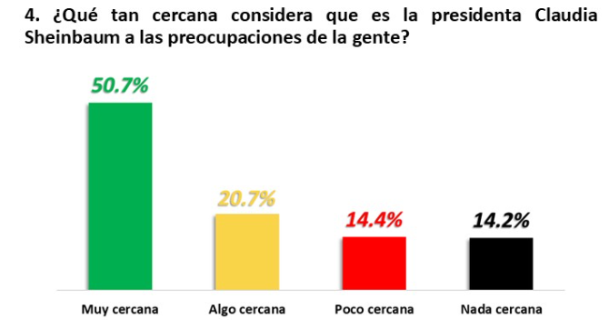 A la pregunta ¿Qué tan cercana considera que es la presidenta a las preocupaciones de la gente? El 50.7% señaló que muy cercana, 20.7% algo cercana, 14.4% poco cercana y 14.2% nada cercana.