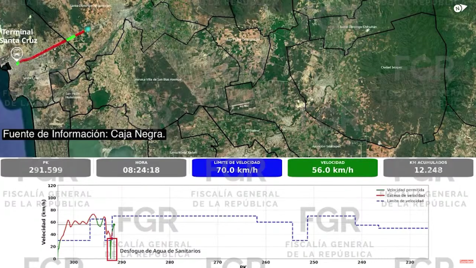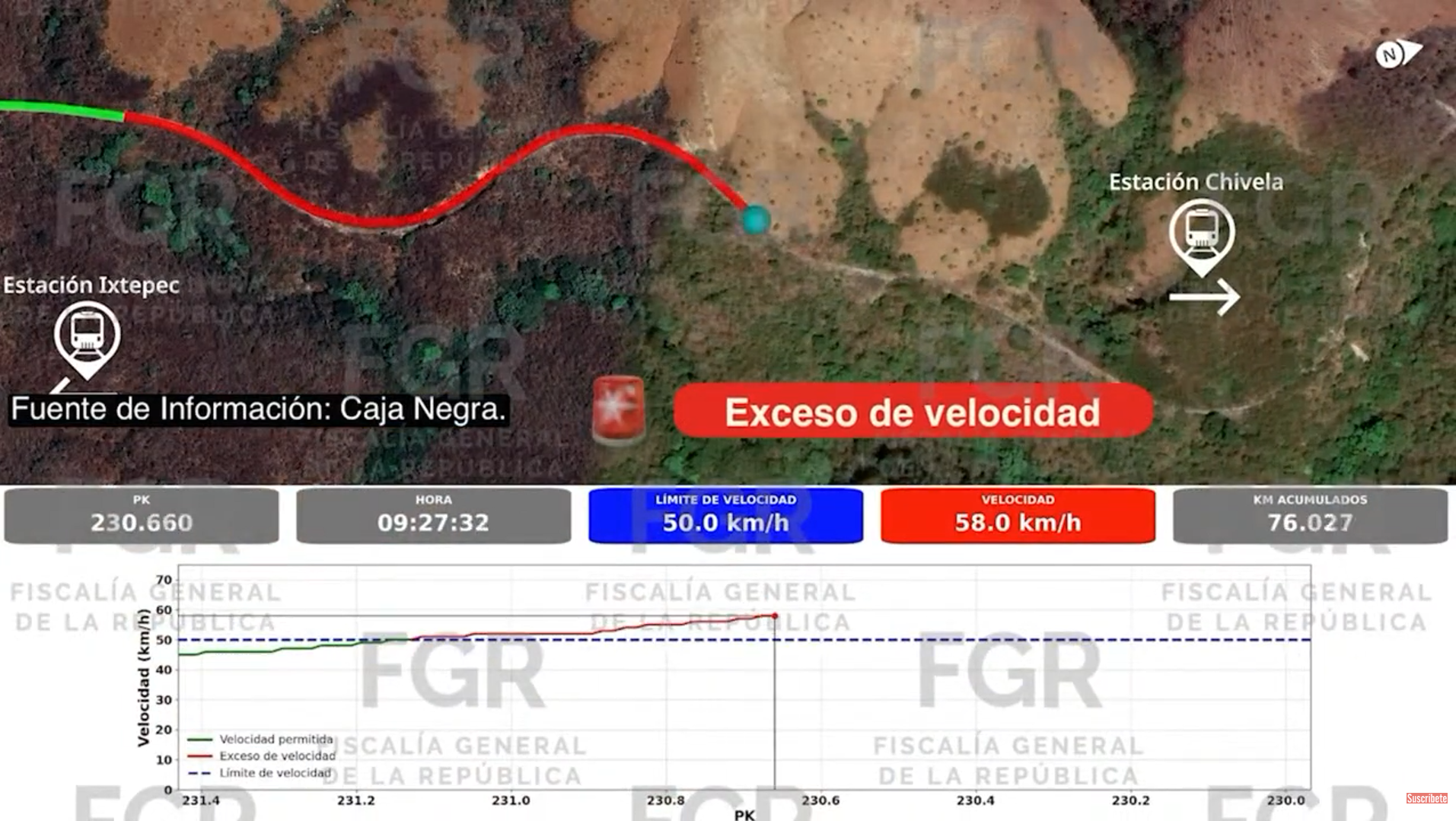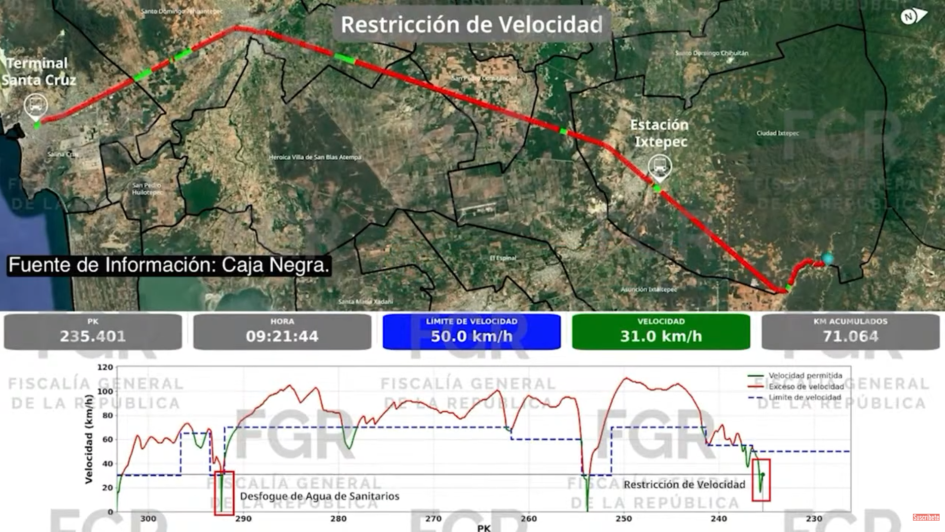 En cuanto a la información contenida en la caja negra de la locomotora guía, la fiscal señaló uno, que el tren llegó a velocidades de 111 kilómetros por hora, en zonas de recta, donde la velocidad máxima permitida es de 70 kilómetros por hora, lo que implica que transitaba 41 kilómetros por encima del límite autorizado.