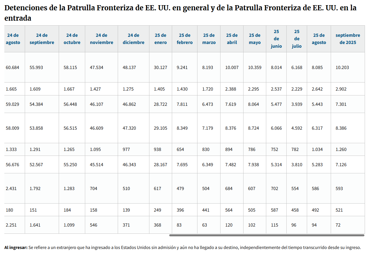 La tendencia descendente se ha acentuado desde el inicio del actual gobierno de Donald Trump, el pasado 20 de enero. De acuerdo con los datos oficiales, durante los primeros ocho meses de su administración (de febrero a septiembre de 2025) se registraron 85 mil 694 “encuentros” migratorios, mientras que en los cuatro meses previos , aún bajo el mandato de Joe Biden, se contabilizaron 357 mil 977.
