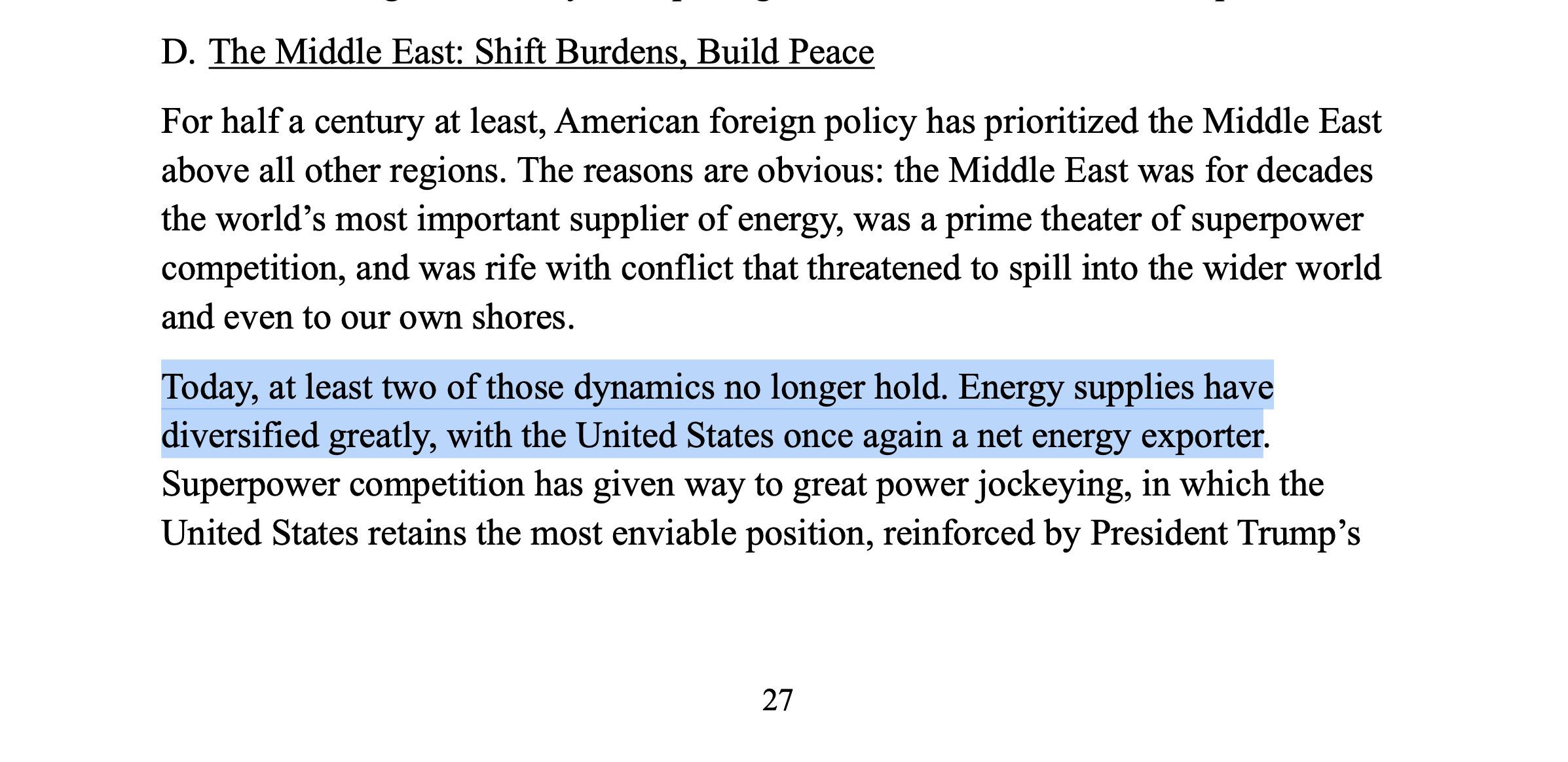 La Estrategia de Seguridad Nacional (NSS), que establece el "Corolario Trump" a la Doctrina Monroe, formaliza el reenfoque del Medio Oriente, señalando la región ha perdido su importancia histórica debido a que Estados Unidos es ahora un exportador neto de energía. En su lugar, el documento ordena un giro hacia el Hemisferio Occidental para restaurar la preeminencia de estadounidense, asegurar cadenas de suministro críticas y proteger el acceso a ubicaciones y recursos estratégicos, condicionando las alianzas a la eliminación de la influencia de competidores extranjeros en la infraestructura y activos de la región.