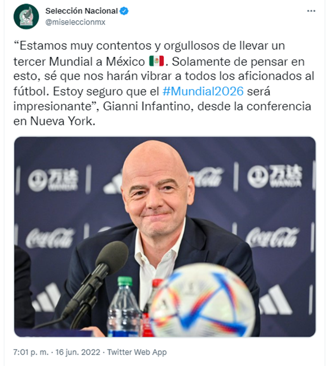 La Federación Mexicana de Futbol (FMF) anunció el pasado 16 de junio en Nueva York que la Ciudad de México, Guadalajara y Monterrey serán sedes del Mundial 2026, convirtiéndose en el primer país a nivel global en albergar una Copa del Mundo de la FIFA por tercera ocasión, teniendo por primera vez a 48 equipos compitiendo por el campeonato mundial.